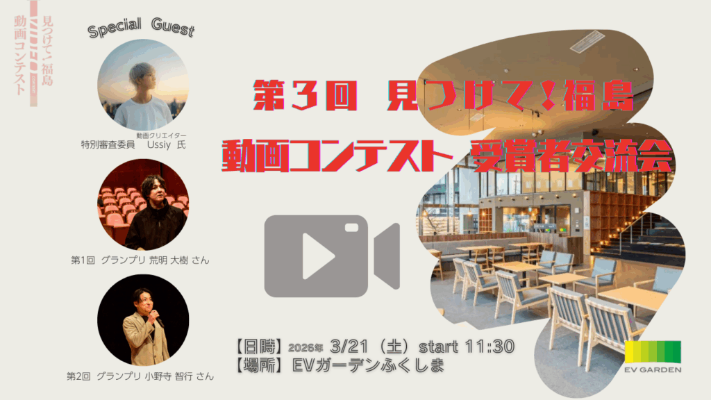 3回目の開催となった「見つけて!福島 動画コンテスト」では、表彰式に代わり、3/21(土)にEVガーデン福島にて交流会を開催します。スペシャルゲストとして、特別審査員で本県出身で動画クリエイターのUssiy氏の他、過去のグランプリ受賞者のお二人お迎えします。第3回の受賞者を囲みつつ、動画制作にご関心をお持ちの皆様と意見交換をしながら、地域の魅力発信のためのコツやヒントなど探っていきたいと思います。
